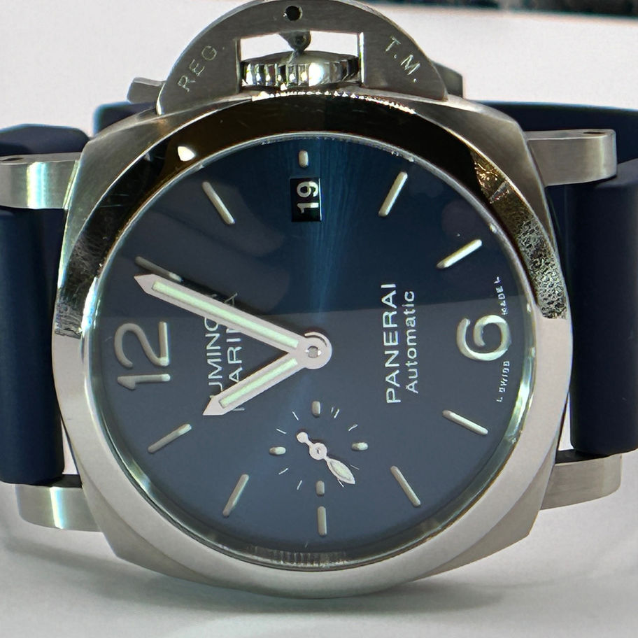 This Panerai Luminor Men's Watch (PAM1085) features a blue dial with Arabic numerals and baton indexes, housed in a 44mm stainless steel case. It has a mechanical (manual) movement and a smooth silver bezel. The watch has a blue rubber two-piece strap with a buckle closure, and is water-resistant up to 100m. This casual style timepiece is part of the distinctive collection offered by Atelier Renaissance, where timeless craftsmanship meets modern elegance. At Atelier Renaissance, we are committed to providing exceptional pieces that embody sophistication and reliability.